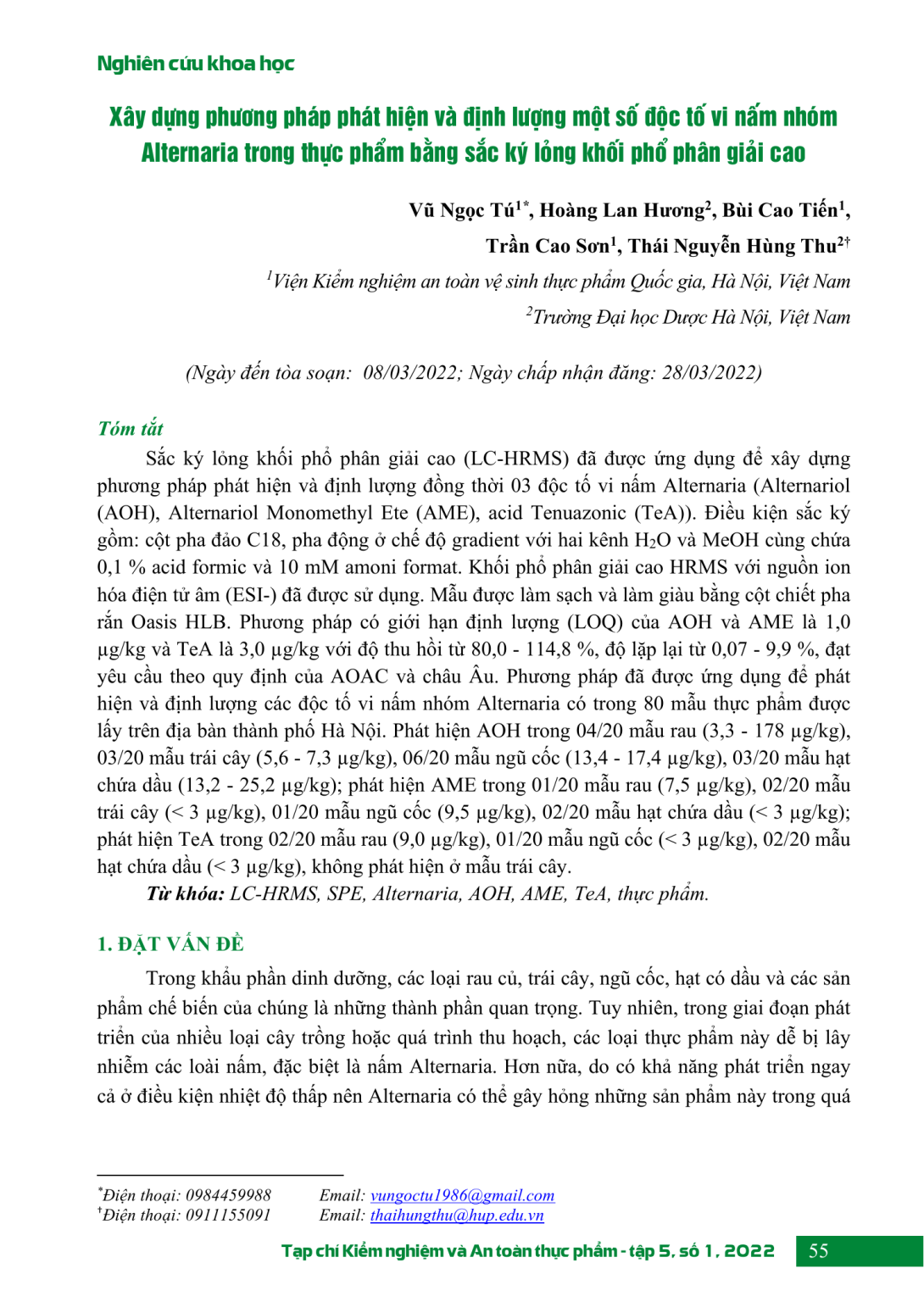 Sắc ký lỏng khối phổ phân giải cao (LC-HRMS) đã được ứng dụng để xây dựng phương pháp phát hiện và định lượng đồng thời 03 độc tố vi nấm Alternaria (Alternariol (AOH), Alternariol Monomethyl Ete (AME), acid Tenuazonic (TeA)). Điều kiện sắc ký gồm: cột pha đảo C18, pha động ở chế độ gradient với hai kênh H2O và MeOH cùng chứa 0,1 % acid formic và 10 mM amoni format. Khối phổ phân giải cao HRMS với nguồn ion hóa điện tử âm (ESI-) đã được sử dụng. Mẫu được làm sạch và làm giàu bằng cột chiết pha rắn Oasis HLB. Phương pháp có giới hạn định lượng (LOQ) của AOH và AME là 1,0 µg/kg và TeA là 3,0 µg/kg với độ thu hồi từ 80,0 - 114,8 %, độ lặp lại từ 0,07 - 9,9 %, đạt yêu cầu theo quy định của AOAC và châu Âu. Phương pháp đã được ứng dụng để phát hiện và định lượng các độc tố vi nấm nhóm Alternaria có trong 80 mẫu thực phẩm được lấy trên địa bàn thành phố Hà Nội. Phát hiện AOH trong 04/20 mẫu rau (3,3 - 178 µg/kg), 03/20 mẫu trái cây (5,6 - 7,3 µg/kg), 06/20 mẫu ngũ cốc (13,4 - 17,4 µg/kg), 03/20 mẫu hạt chứa dầu (13,2 - 25,2 µg/kg); phát hiện AME trong 01/20 mẫu rau (7,5 µg/kg), 02/20 mẫu trái cây (< 3 µg/kg), 01/20 mẫu ngũ cốc (9,5 µg/kg), 02/20 mẫu hạt chứa dầu (< 3 µg/kg); phát hiện TeA trong 02/20 mẫu rau (9,0 µg/kg), 01/20 mẫu ngũ cốc (< 3 µg/kg), 02/20 mẫu hạt chứa dầu (< 3 µg/kg), không phát hiện ở mẫu trái cây.
