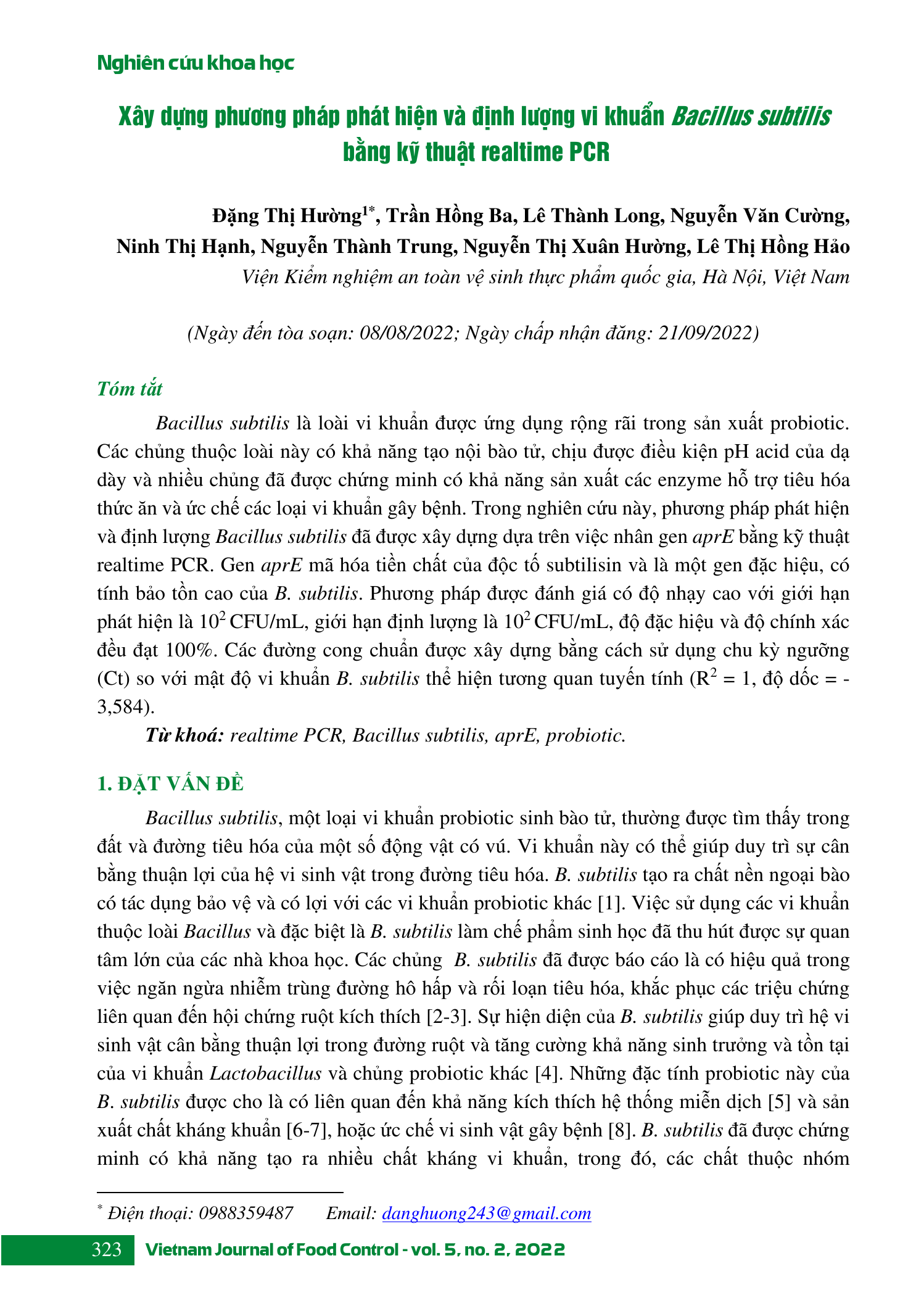Bacillus subtilis là loài vi khuẩn được ứng dụng rộng rãi trong sản xuất probiotic. Các chủng thuộc loài này có khả năng tạo nội bào tử, chịu được điều kiện pH acid của dạ dày và nhiều chủng đã được chứng minh có khả năng sản xuất các enzyme hỗ trợ tiêu hóa thức ăn và ức chế các loại vi khuẩn gây bệnh. Trong nghiên cứu này, phương pháp phát hiện và định lượng Bacillus subtilis đã được xây dựng dựa trên việc nhân gen aprE bằng kỹ thuật realtime PCR. Gen aprE mã hóa tiền chất của độc tố subtilisin và là một gen đặc hiệu, có tính bảo tồn cao của B. subtilis. Phương pháp được đánh giá có độ nhạy cao với giới hạn phát hiện là 102 CFU/mL, giới hạn định lượng là 102 CFU/mL, độ đặc hiệu và độ chính xác đều đạt 100%. Các đường cong chuẩn được xây dựng bằng cách sử dụng chu kỳ ngưỡng (Ct) so với mật độ vi khuẩn B. subtilis thể hiện tương quan tuyến tính (R2 = 1, độ dốc = - 3,584).