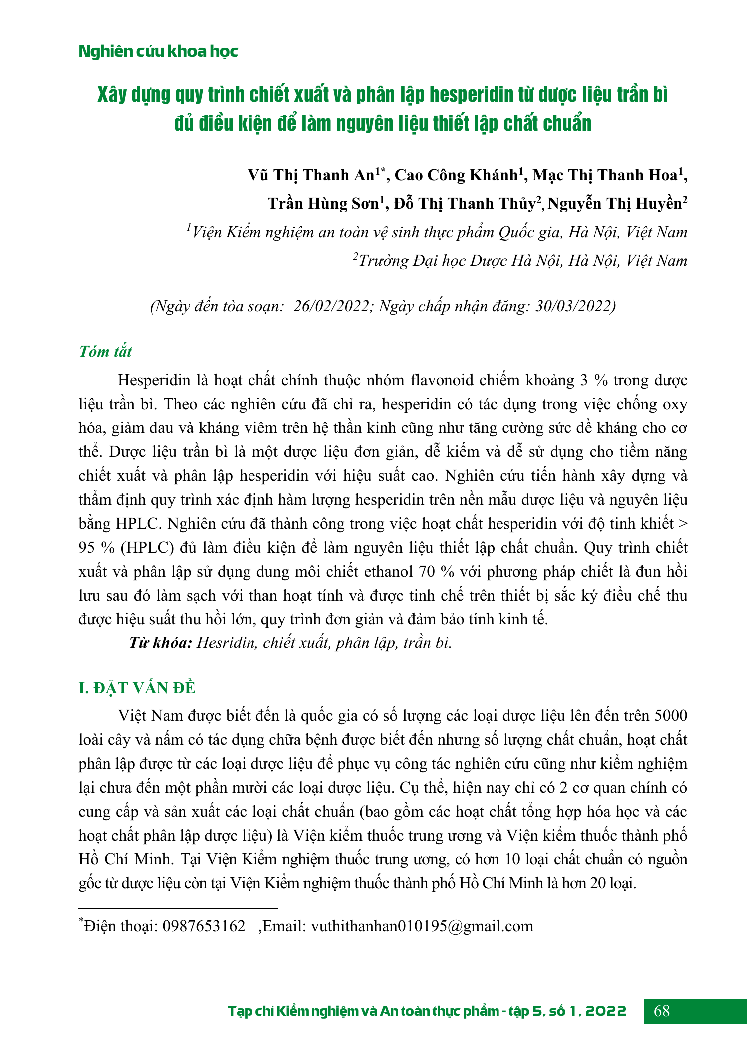 Hesperidin là hoạt chất chính thuộc nhóm flavonoid chiếm khoảng 3 % trong dược liệu trần bì. Theo các nghiên cứu đã chỉ ra, hesperidin có tác dụng trong việc chống oxy hóa, giảm đau và kháng viêm trên hệ thần kinh cũng như tăng cường sức đề kháng cho cơ thể. Dược liệu trần bì là một dược liệu đơn giản, dễ kiếm và dễ sử dụng cho tiềm năng chiết xuất và phân lập hesperidin với hiệu suất cao. Nghiên cứu tiến hành xây dựng và thẩm định quy trình xác định hàm lượng hesperidin trên nền mẫu dược liệu và nguyên liệu bằng HPLC. Nghiên cứu đã thành công trong việc hoạt chất hesperidin với độ tinh khiết > 95 % (HPLC) đủ làm điều kiện để làm nguyên liệu thiết lập chất chuẩn. Quy trình chiết xuất và phân lập sử dụng dung môi chiết ethanol 70 % với phương pháp chiết là đun hồi lưu sau đó làm sạch với than hoạt tính và được tinh chế trên thiết bị sắc ký điều chế thu được hiệu suất thu hồi lớn, quy trình đơn giản và đảm bảo tính kinh tế.