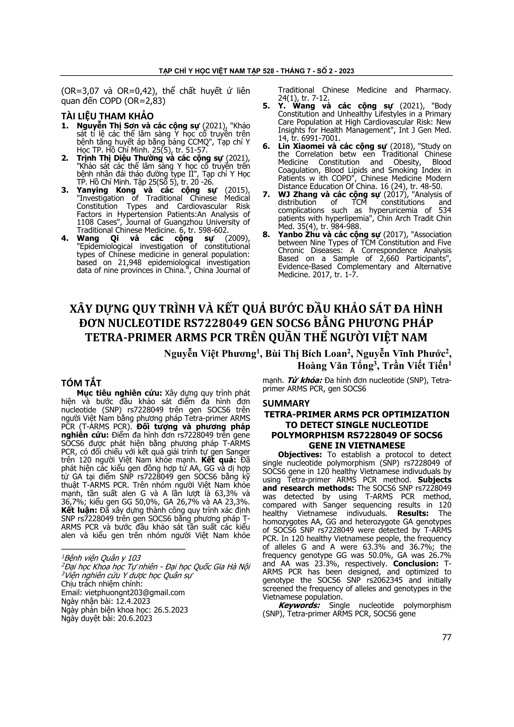 Xây dựng quy trình phát hiện và bước đầu khảo sát điểm đa hình đơn nucleotide (SNP) rs7228049 trên gen SOCS6 trên người Việt Nam bằng phương pháp Tetra-primer ARMS PCR (T-ARMS PCR). Đối tượng và phương pháp nghiên cứu: Điểm đa hình đơn rs7228049 trên gene SOCS6 được phát hiện bằng phương pháp T-ARMS PCR, có đối chiếu với kết quả giải trình tự gen Sanger trên 120 người Việt Nam khỏe mạnh. Kết quả: Đã phát hiện các kiểu gen đồng hợp tử AA, GG và dị hợp tử GA tại điểm SNP rs7228049 gen SOCS6 bằng kỹ thuật T-ARMS PCR. Trên nhóm người Việt Nam khỏe mạnh, tần suất alen G và A lần lượt là 63,3% và 36,7%; kiểu gen GG 50,0%, GA 26,7% và AA 23,3%. Kết luận: Đã xây dựng thành công quy trình xác định SNP rs7228049 trên gen SOCS6 bằng phương pháp T-ARMS PCR và bước đầu khảo sát tần suất các kiểu alen và kiểu gen trên nhóm người Việt Nam khỏe mạnh.