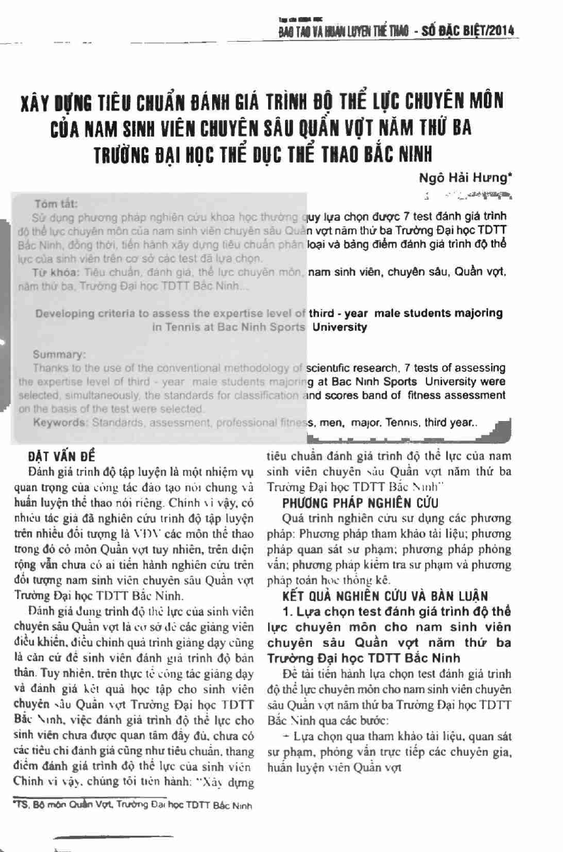 Xây dựng tiêu chuẩn đánh giá trình độ thể lực chuyên môn của nam sinh viên chuyên sâu quần vợt năm thứ ba trường Đại học Thể dục thể thao Bắc Ninh