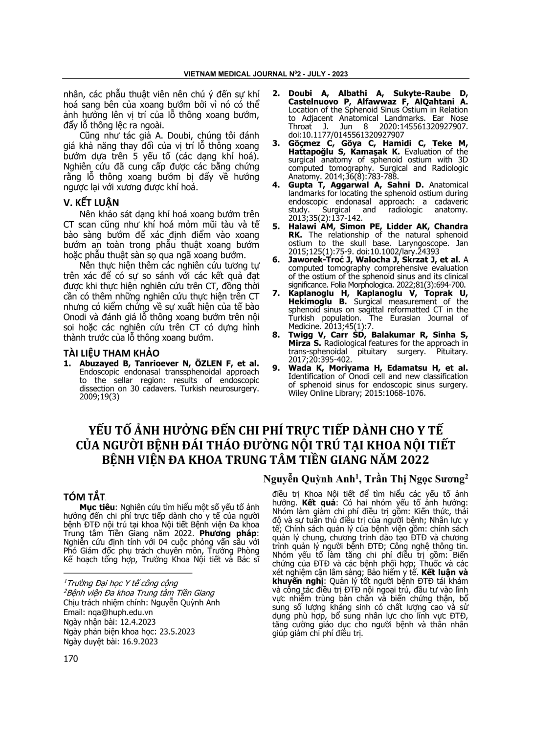 Nghiên cứu tìm hiểu một số yếu tố ảnh hưởng đến chi phí trực tiếp dành cho y tế của người bệnh ĐTĐ nội trú tại khoa Nội tiết Bệnh viện Đa khoa Trung tâm Tiền Giang năm 2022. Phương pháp: Nghiên cứu định tính với 04 cuộc phỏng vấn sâu với Phó Giám đốc phụ trách chuyên môn, Trưởng Phòng Kế hoạch tổng hợp, Trưởng Khoa Nội tiết và Bác sĩ điều trị Khoa Nội tiết để tìm hiểu các yếu tố ảnh hưởng. Kết quả: Có hai nhóm yếu tố ảnh hưởng: Nhóm làm giảm chi phí điều trị gồm: Kiến thức, thái độ và sự tuân thủ điều trị của người bệnh; Nhân lực y tế; Chính sách quản lý của bệnh viện gồm: chính sách quản lý chung, chương trình đào tạo ĐTĐ và chương trình quản lý người bệnh ĐTĐ; Công nghệ thông tin. Nhóm yếu tố làm tăng chi phí điều trị gồm: Biến chứng của ĐTĐ và các bệnh phối hợp; Thuốc và các xét nghiệm cận lâm sàng; Bảo hiểm y tế. Kết luận và khuyến nghị: Quản lý tốt người bệnh ĐTĐ tái khám và công tác điều trị ĐTĐ nội ngoại trú, đầu tư vào lĩnh vực nhiễm trùng bàn chân và biến chứng thận, bổ sung số lượng kháng sinh có chất lượng cao và sử dụng phù hợp, bổ sung nhân lực cho lĩnh vực ĐTĐ, tăng cường giáo dục cho người bệnh và thân nhân giúp giảm chi phí điều trị.