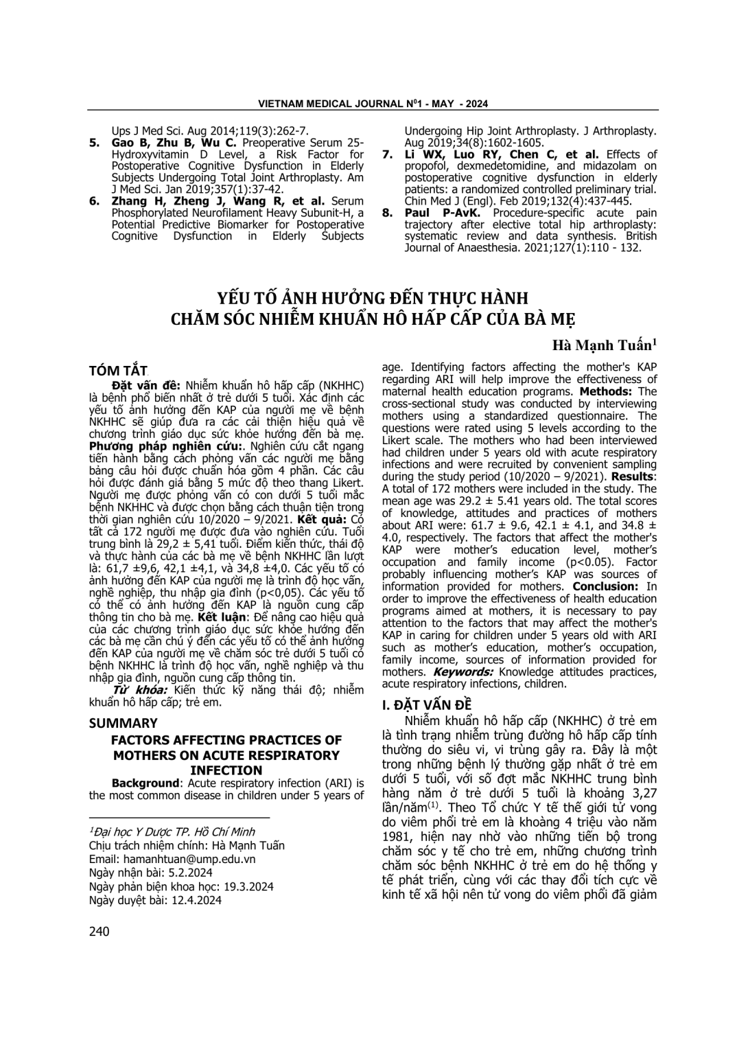 Nhiễm khuẩn hô hấp cấp (NKHHC) là bệnh phổ biến nhất ở trẻ dưới 5 tuổi. Xác định các yếu tố ảnh hưởng đến KAP của người mẹ về bệnh NKHHC sẽ giúp đưa ra các cải thiện hiệu quả về chương trình giáo dục sức khỏe hướng đến bà mẹ. Phương pháp nghiên cứu:. Nghiên cứu cắt ngang tiến hành bằng cách phỏng vấn các người mẹ bằng bảng câu hỏi được chuẩn hóa gồm 4 phần. Các câu hỏi được đánh giá bằng 5 mức độ theo thang Likert. Người mẹ được phỏng vấn có con dưới 5 tuổi mắc bệnh NKHHC và được chọn bằng cách thuận tiện trong thời gian nghiên cứu 10/2020 – 9/2021. Kết quả: Có tất cả 172 người mẹ được đưa vào nghiên cứu. Tuổi trung bình là 29,2 ± 5,41 tuổi. Điểm kiến thức, thái độ và thực hành của các bà mẹ về bệnh NKHHC lần lượt là: 61,7 ±9,6, 42,1 ±4,1, và 34,8 ±4,0. Các yếu tố có ảnh hưởng đến KAP của người mẹ là trình độ học vấn, nghề nghiệp, thu nhập gia đình (p<0,05). Các yếu tố có thể có ảnh hưởng đến KAP là nguồn cung cấp thông tin cho bà mẹ. Kết luận: Để nâng cao hiệu quả của các chương trình giáo dục sức khỏe hướng đến các bà mẹ cần chú ý đến các yếu tố có thể ảnh hưởng đến KAP của người mẹ về chăm sóc trẻ dưới 5 tuổi có bệnh NKHHC là trình độ học vấn, nghề nghiệp và thu nhập gia đình, nguồn cung cấp thông tin.