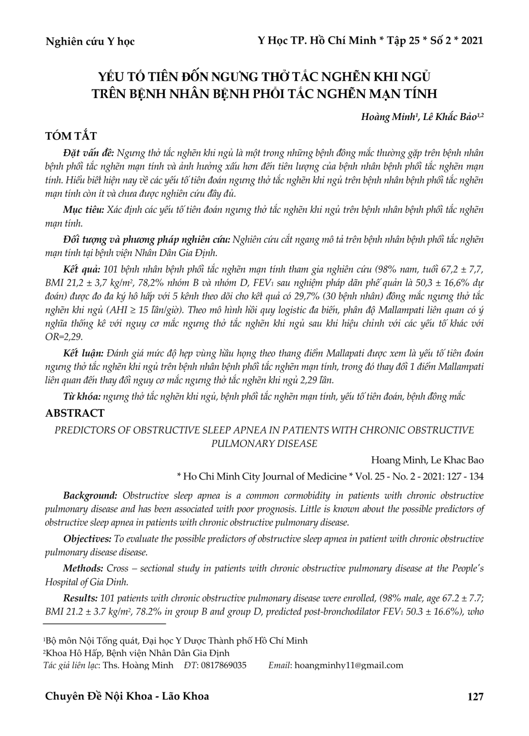 Xác định các yếu tố tiên đoán ngưng thở tắc nghẽn khi ngủ trên bệnh nhân bệnh phổi tắc nghẽn mạn tính. Đối tượng và phương pháp nghiên cứu Nghiên cứu cắt ngang mô tả trên bệnh nhân bệnh phổi tắc nghẽn mạn tính tại bệnh viện Nhân Dân Gia Định. Kết quả 101 bệnh nhân bệnh phổi tắc nghẽn mạn tính tham gia nghiên cứu (98% nam, tuổi 67,2 ± 7,7, BMI 21,2 ± 3,7 kg/m2, 78,2% nhóm B và nhóm D, FEV1 sau nghiệm pháp dãn phế quản là 50,3 ± 16,6% dự đoán) được đo đa ký hô hấp với 5 kênh theo dõi cho kết quả có 29,7% (30 bệnh nhân) đồng mắc ngưng thở tắc nghẽn khi ngủ (AHI ≥ 15 lần/giờ). Theo mô hình hồi quy logistic đa biến, phân độ Mallampati liên quan có ý nghĩa thống kê với nguy cơ mắc ngưng thở tắc nghẽn khi ngủ sau khi hiệu chỉnh với các yếu tố khác với OR=2,29. Kết luận Đánh giá mức độ hẹp vùng hầu họng theo thang điểm Mallapati được xem là yếu tố tiên đoán ngưng thở tắc nghẽn khi ngủ trên bệnh nhân bệnh phổi tắc nghẽn mạn tính, trong đó thay đổi 1 điểm Mallampati liên quan đến thay đổi nguy cơ mắc ngưng thở tắc nghẽn khi ngủ 2,29 lần.
